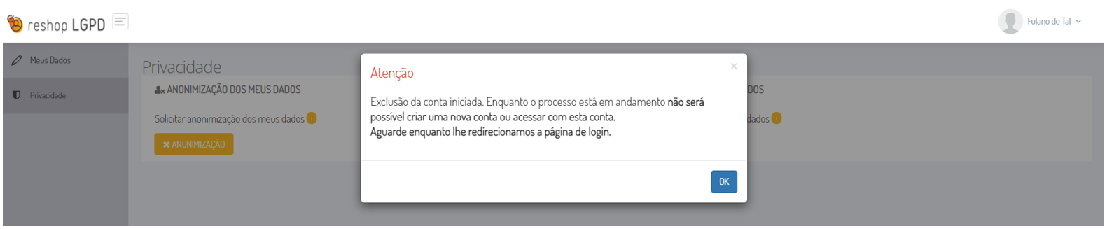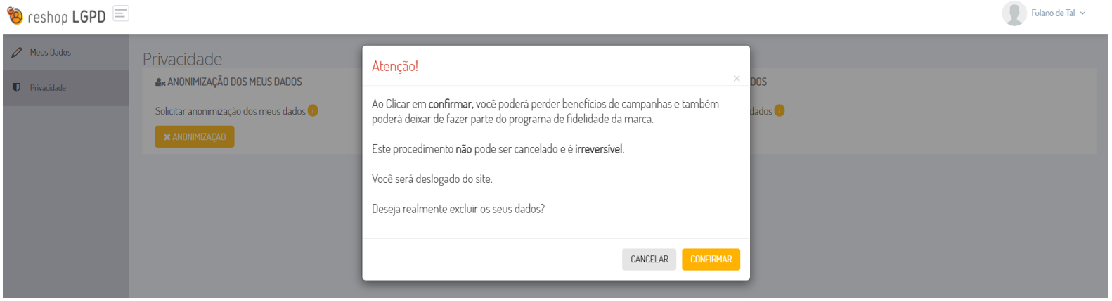Essa opção fará com que o cadastro do cliente seja removido definitivamente do banco de dados do sistema. Porém, neste caso, o cliente não poderá fazer um novo cadastro, se desejar acessar o portal Reshop novamente.