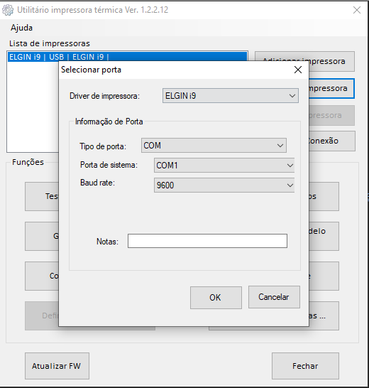 Ao adicionar a impressora no utilitário, verificar se a impressora está com Porta de COMUNICAÇÃO do Tipo COM: