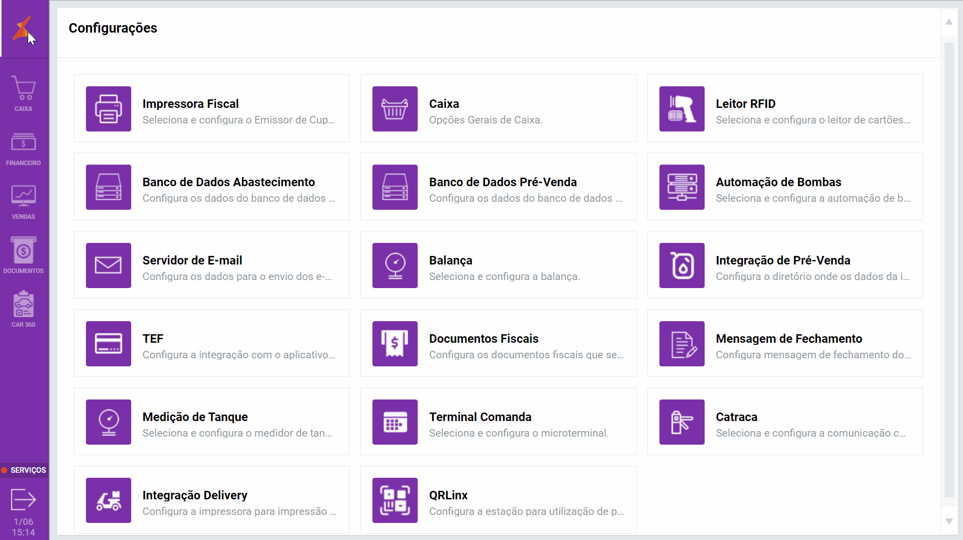 1. Abrir o PDV, fazer login e acessar Menu > Configurações > Documentos Fiscais.