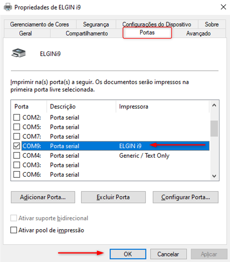 10. Na aba Portas, apenas verificar que a porta selecionada é a mesma da configurada na instalação, e clicar em OK.