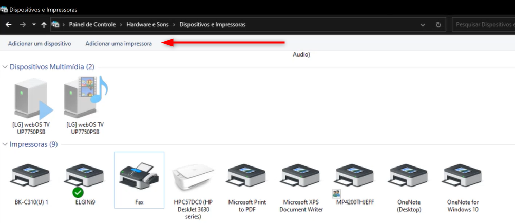 2. Agora no Windows em Painel de Controle - Dispositivos e Impressoras adicionar manualmente uma nova impressora, clicando em Adicionar uma impressora: