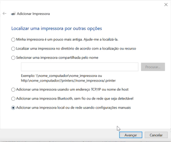4. Selecionar a opção Adicionar uma impressora local ou rede usando configurações manuais e clicar em Avançar: