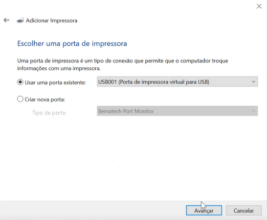 5. Escolher uma porta de impressora na opção Usar uma porta existente e na sequencia clicar em Avançar.