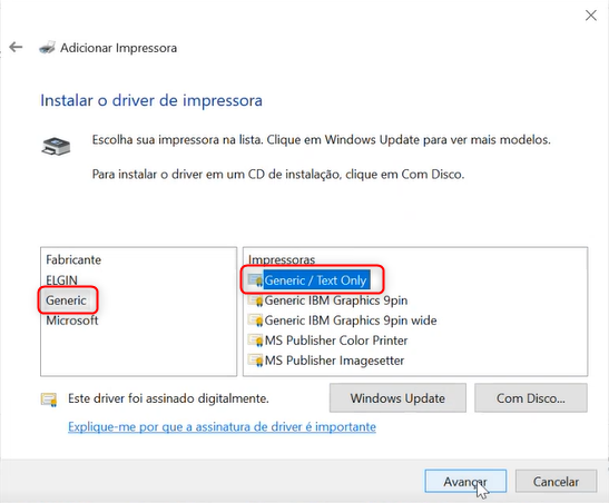 Nesta tela, escolher o fabricante Generic e a impressora Generic /Text Only e pressionar Avançar: