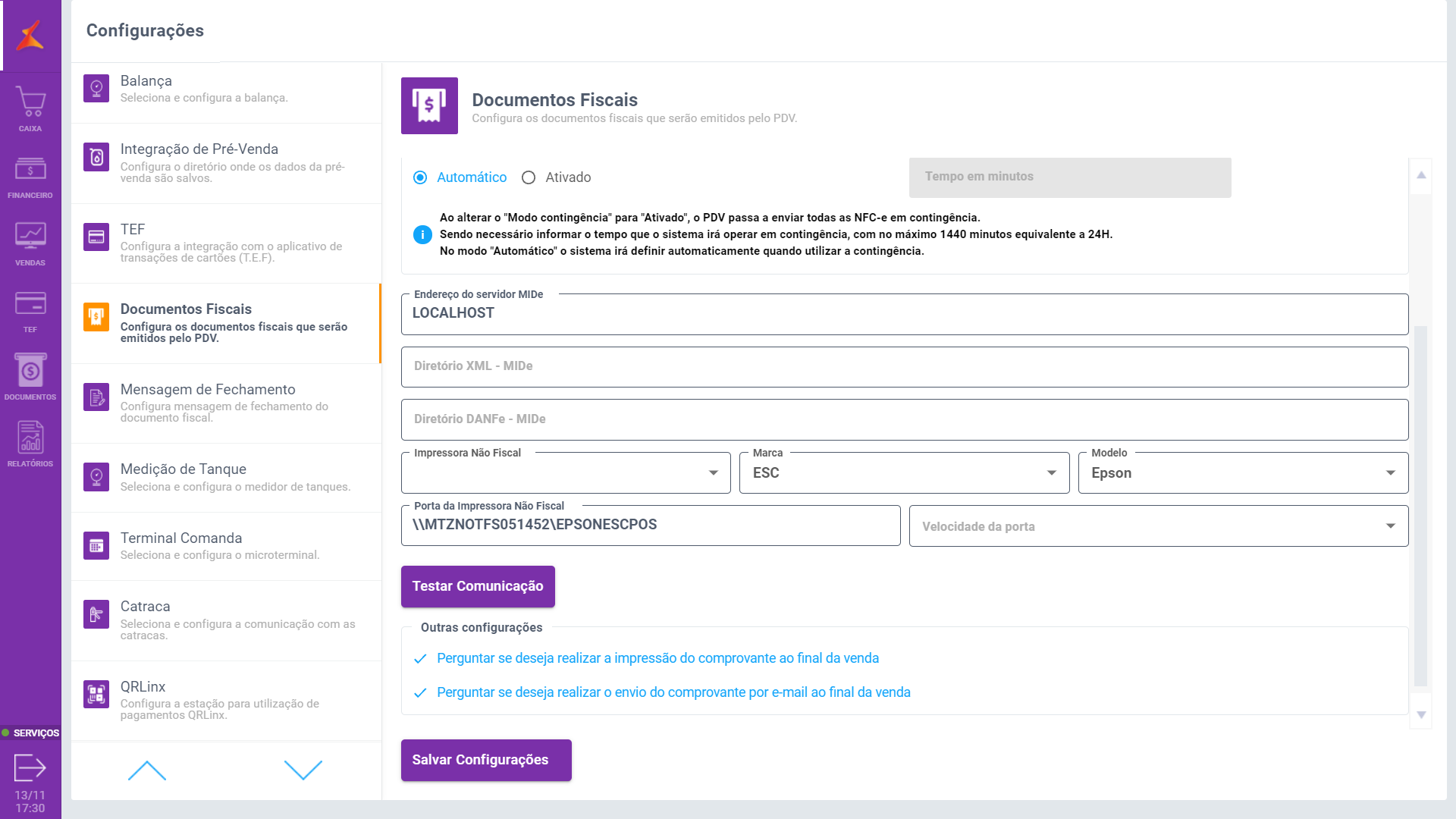 - Porta da Impressora não Fiscal: inserir o endereço compartilhado da impressora, no exemplo foi utilizado \\MTZNOTFS051452\EPSONESCPOS (certificar-se de que não exista espaços em branco antes, e depois do nome da impressora).