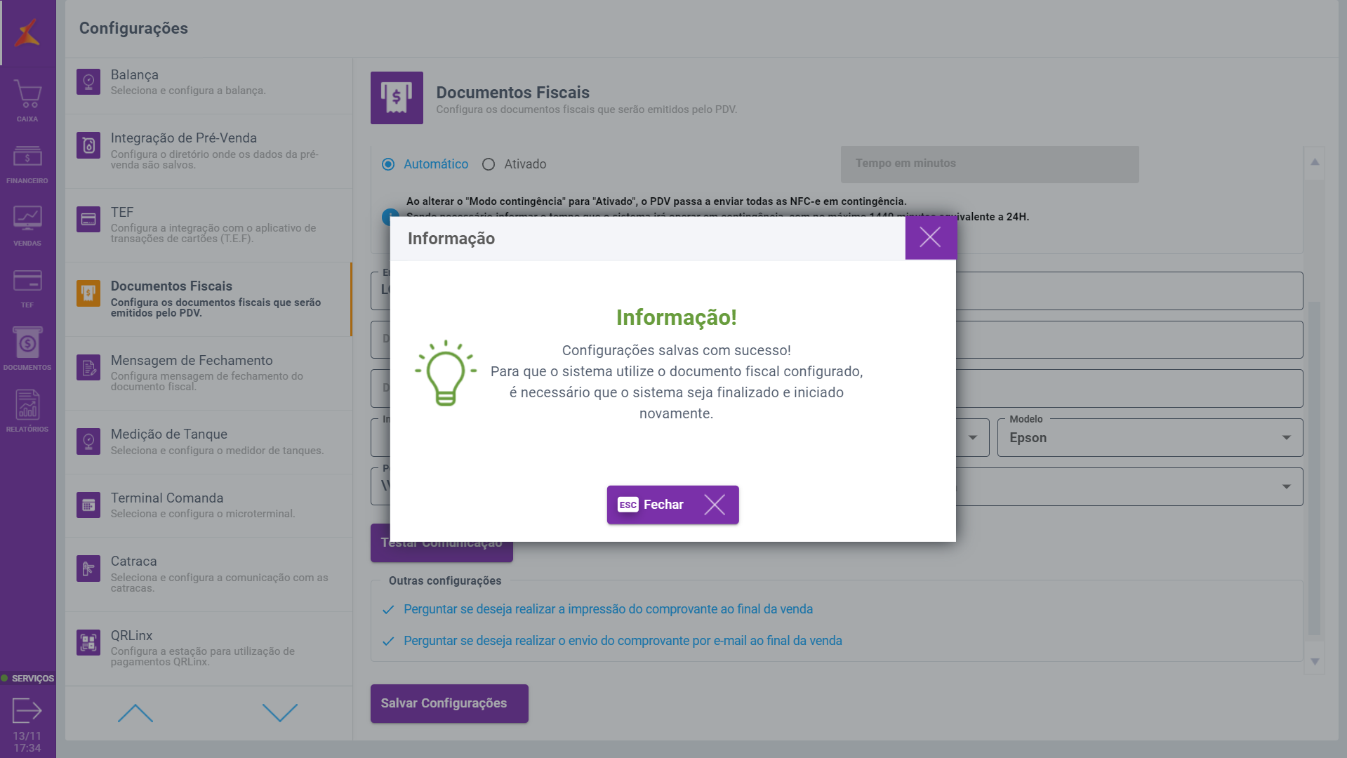 3. Para que as configurações sejam aplicadas, será necessário fechar o PDV e iniciar novamente.