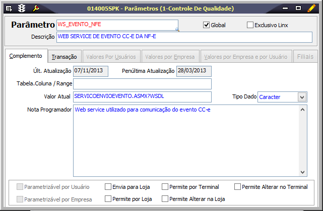3. No campo Parâmetro, pesquise WS_EVENTO_NFE.