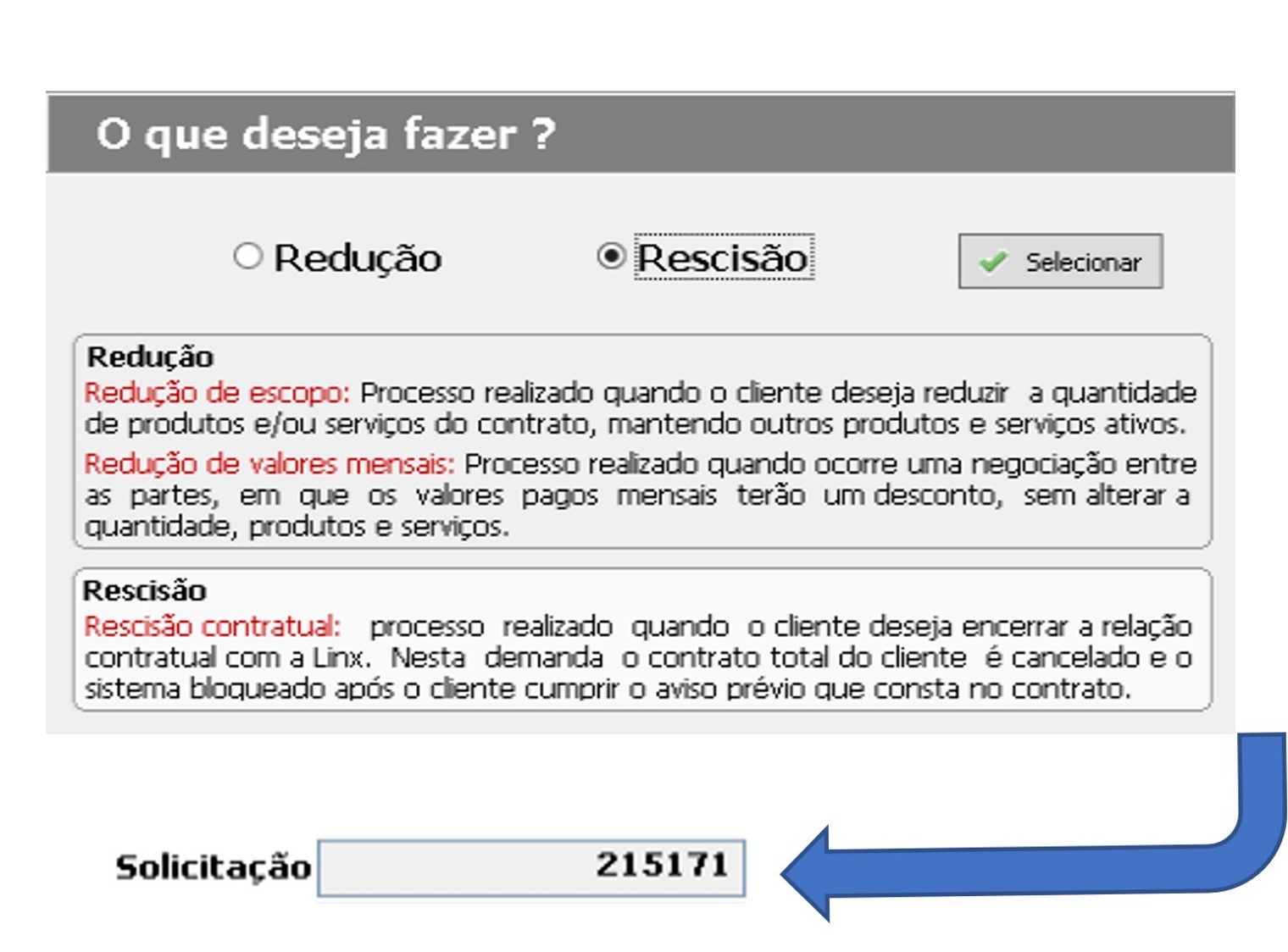 Rescisão Contratual com a LINX: Processo realizado quando o cliente deseja encerrar a relação contratual com a Linx. Nesta demanda o contrato total do cliente é cancelado e o sistemas bloqueado após o cliente cumprir o aviso prévio que consta no contrato.