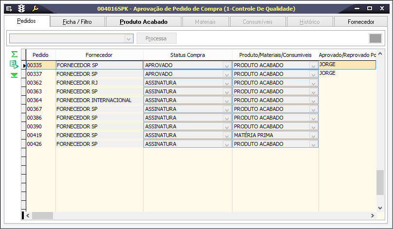 Compras de Produto Acabado (004006) | Atualiza o campo "Status aprovação", apresentado na página "Cabeçalho", conforme alteração realizada. |