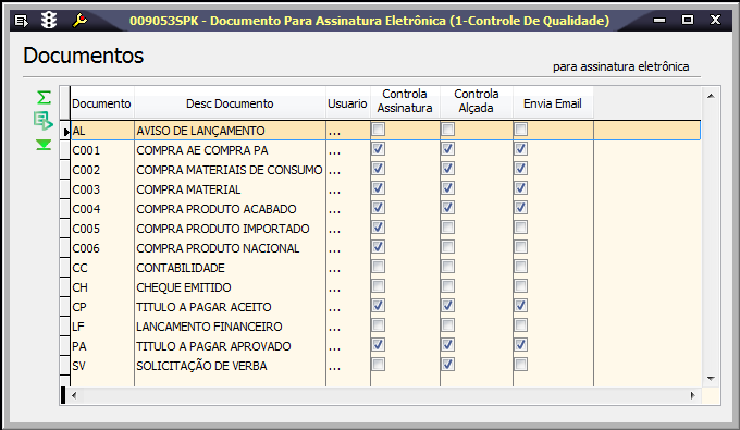 Em uma empresa, pode tornar-se necessário um processo de autorização de documentos específicos por diversos níveis hierárquicos, visando maior controle das operações efetuadas. É possível administrar as alçadas de aprovação de cada nível hierárquico através da funcionalidade de Assinatura Eletrônica e controlar a autorização de documentos como pedidos de compra e títulos a pagar, por exemplo. Para tanto, é necessário informar nesta tela quais são os documentos que necessitam de aprovação, e indicar os usuários que estão autorizados a realizar este procedimento.