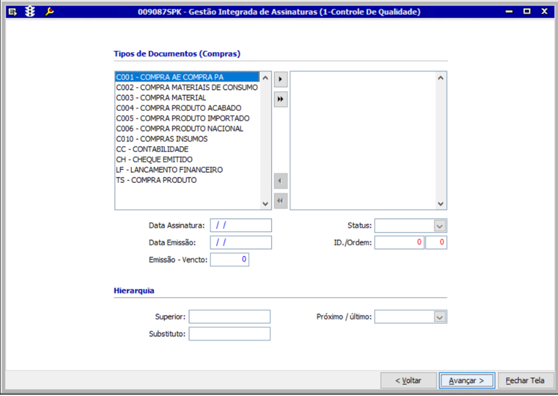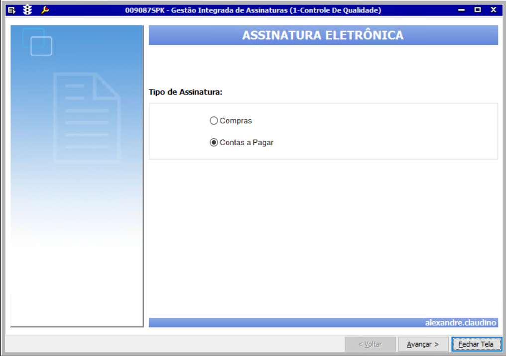 | Tipo de Assinatura | RadioButton | Permite selecionar o tipo de assinatura (Compras ou Contas a Pagar). |
