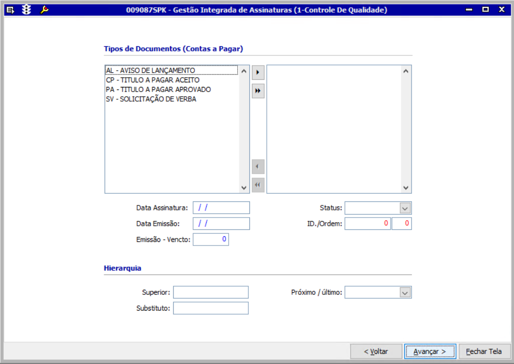 | Hierarquia | Refere-se ao nível de responsabilidade no fluxo de aprovação. Indica se o usuário atual é "Superior", "Substituto" ou outro tipo de hierarquia relacionada à assinatura. |