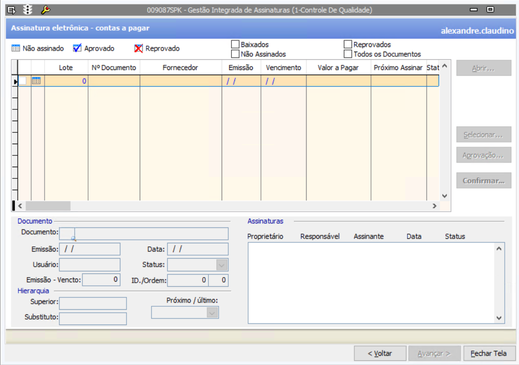 | Superior | O conteúdo deste campo apresenta o usuário indicado como superior do usuário que está utilizando o sistema, conforme apresentado no campo Usuário. Estas informações são extraídas da tela 009054 - Hierarquia para Assinatura Eletrônica. |