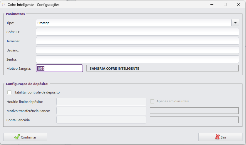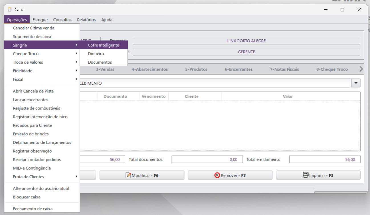 Acesse Caixa → Operações → Sangria → Cofre Inteligente.