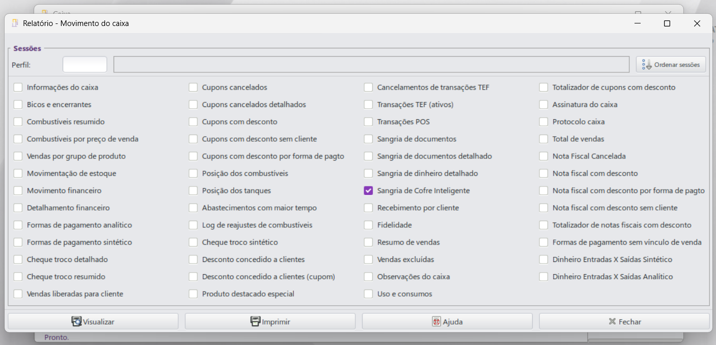 Acesse Caixa→ Relatórios→ Movimento do Caixa, marcar o checkbox Sangria do Cofre Inteligente.