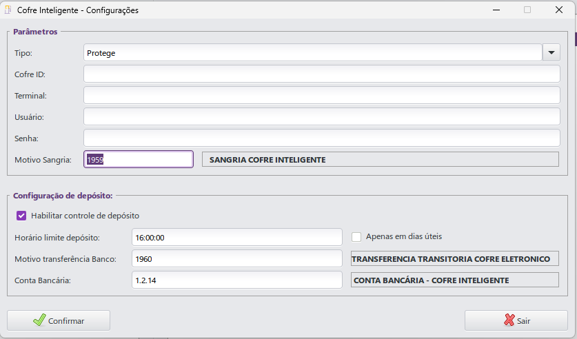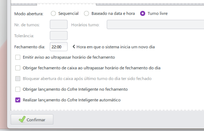 Nessa opção, é definido um horário limite para que os depósitos do Cofre Inteligente sejam creditados na conta bancária no mesmo dia. Após esse horário limite, o sistema passa a lançar os valores na conta bancária somente no próximo dia.