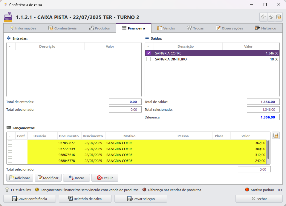 Para realizar a sangria, selecione o registro e clique no botão "Baixar". Na tela principal do Caixa, será listado a sangria na aba 1-Saídas.