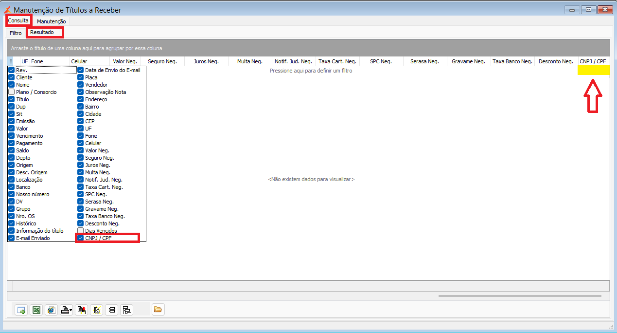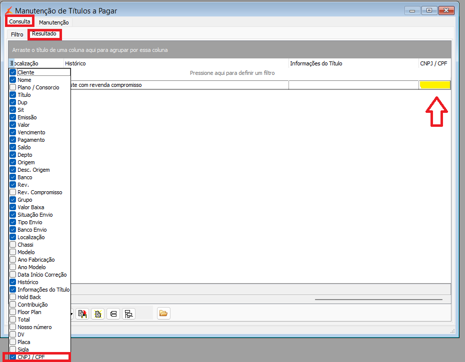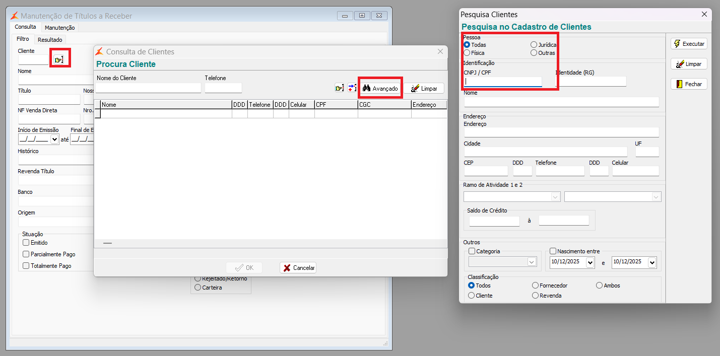 Funcionamento dos Programas Títulos a Pagar, Títulos a Receber, e Baixa de Títulos por Data, tendo à disposição os campos de CNPJ e CPF do cliente nos resultados das consultas dos títulos.
