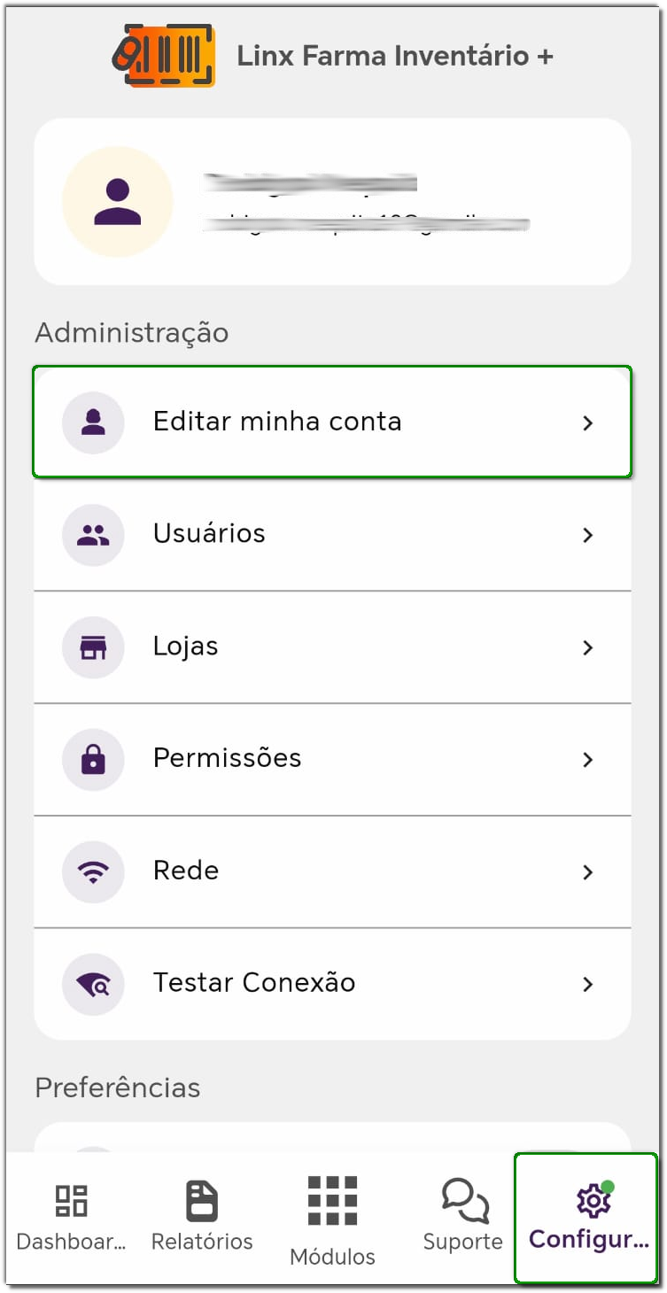 Linx Farma Inventário + - Configurações de contas - Como realizar a configuração e atualização de dados cadastrais no aplicativo