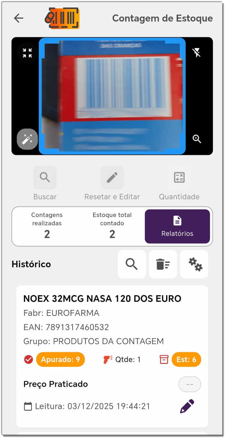 6. De volta à tela principal de Contagem de Estoque, na seção 'Histórico' é exibida a lista dos produtos já contados e as suas respectivas informações
