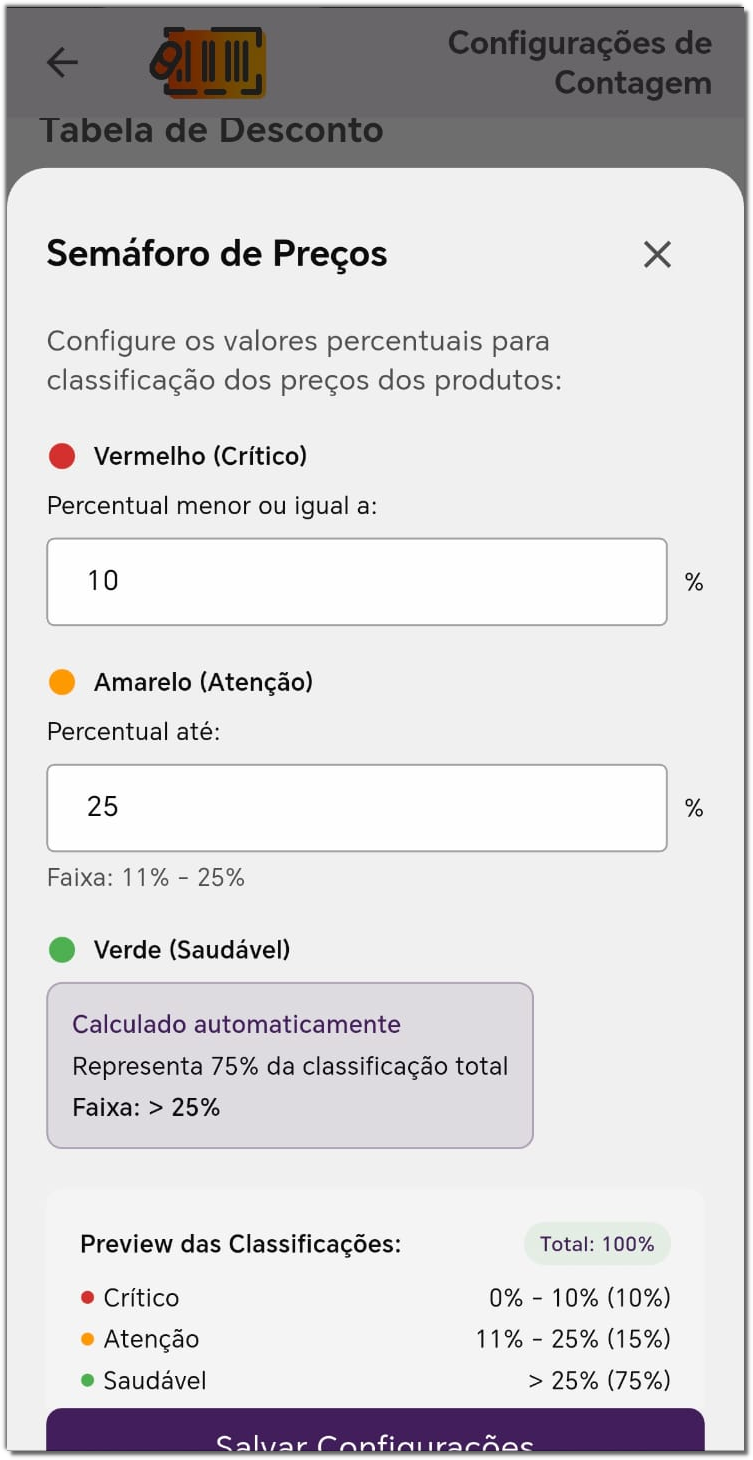 17. Na seção 'Semáforo de Preços', configure os percentuais para classificação de preços dos produtos;
