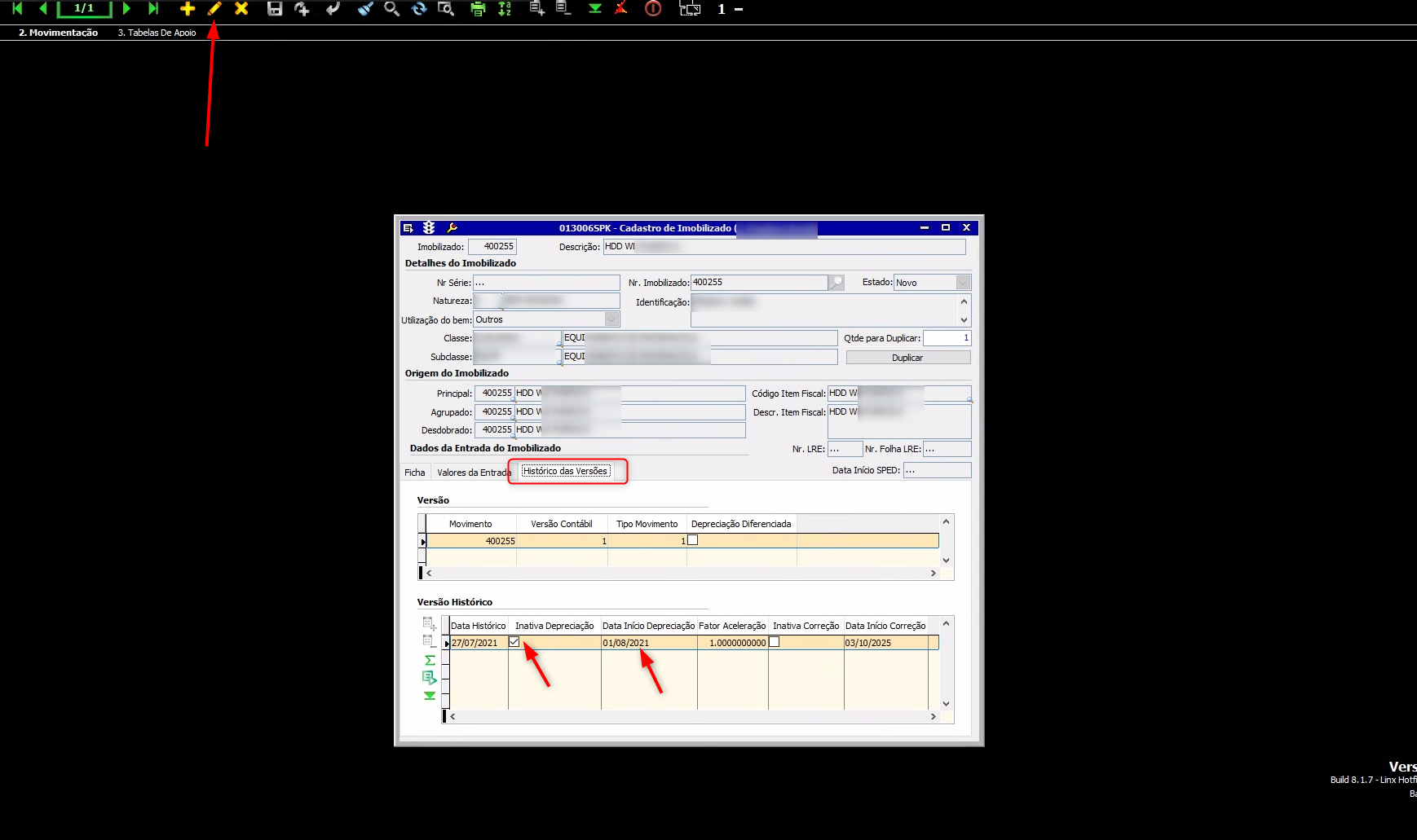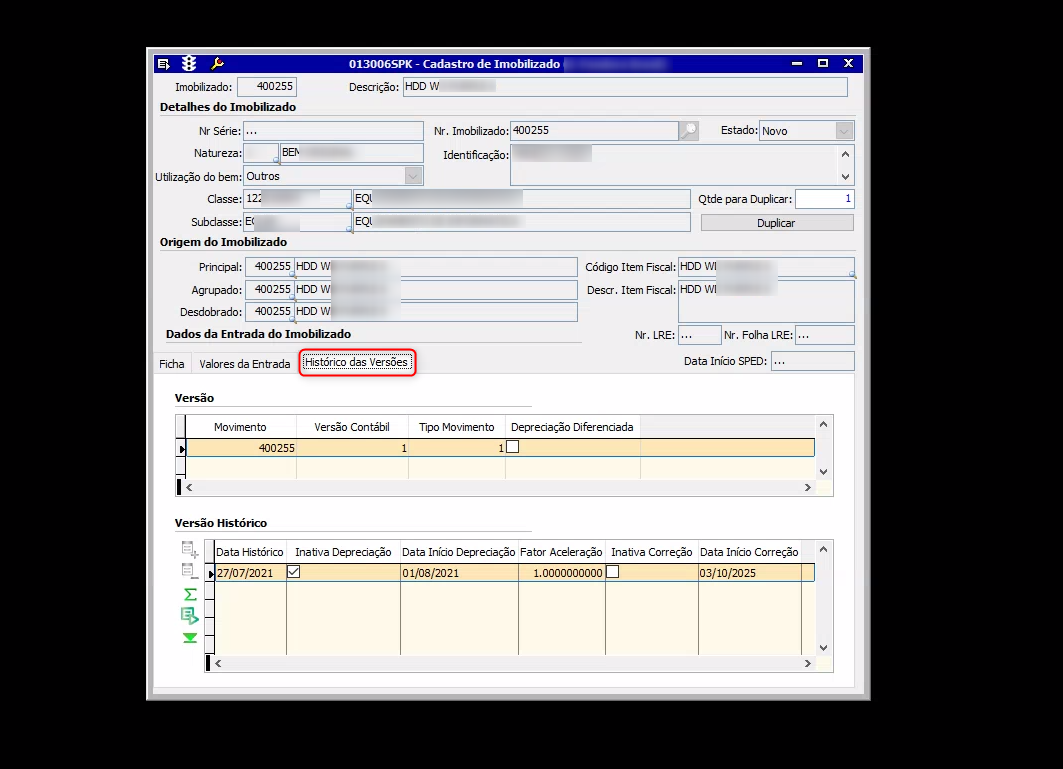 1. Acesse a tela 013006SPK – Cadastro de Imobilizado e vá até o menu Histórico das Versões: