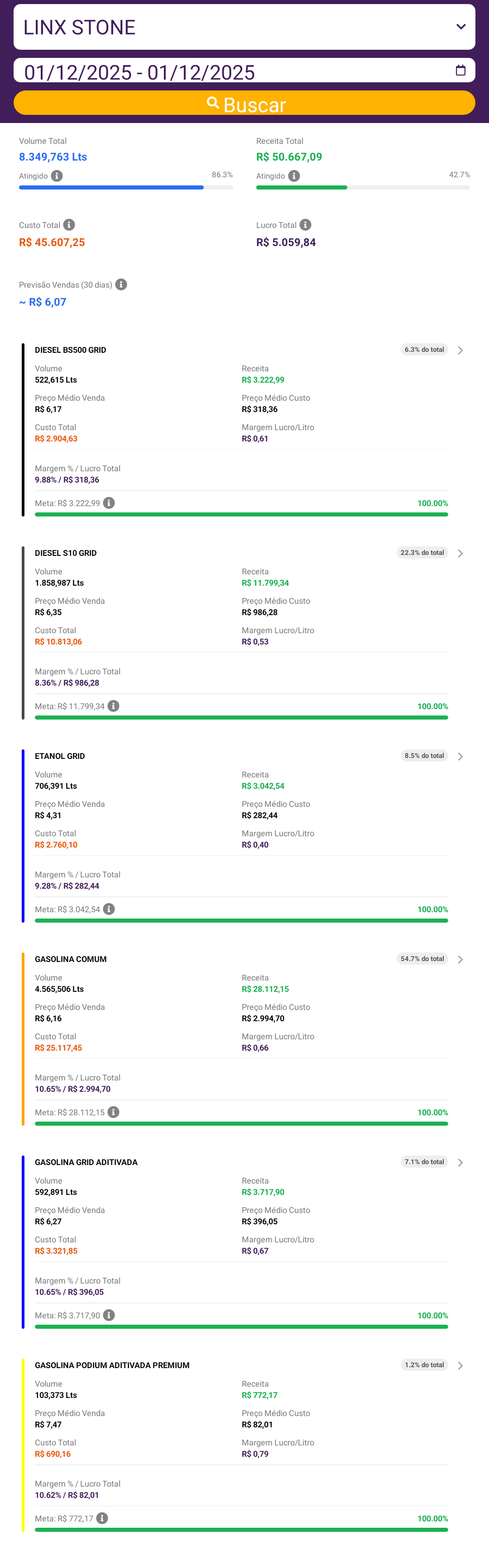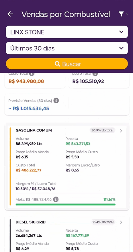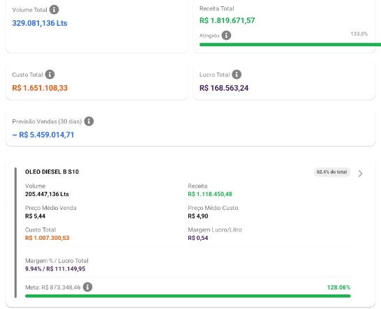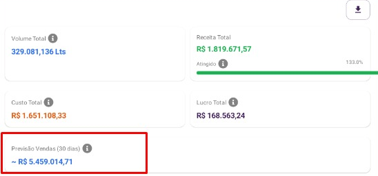 O valor apresentado no cartão de previsão corresponde ao cálculo do volume de litros previsto multiplicado pela margem.