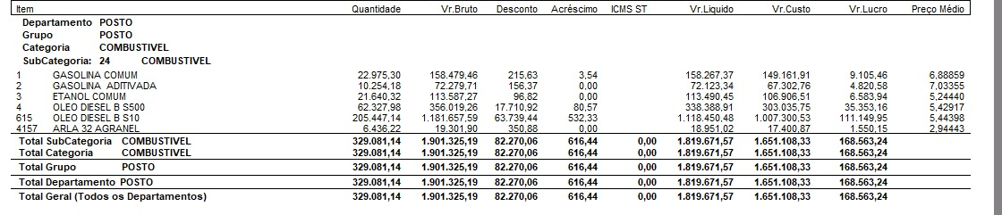 Este relatório somente exibirá o produto ARLA caso ele esteja configurado dentro do mesmo filtro utilizado para os combustíveis. No exemplo apresentado, o produto ARLA está incluído na mesma subcategoria.