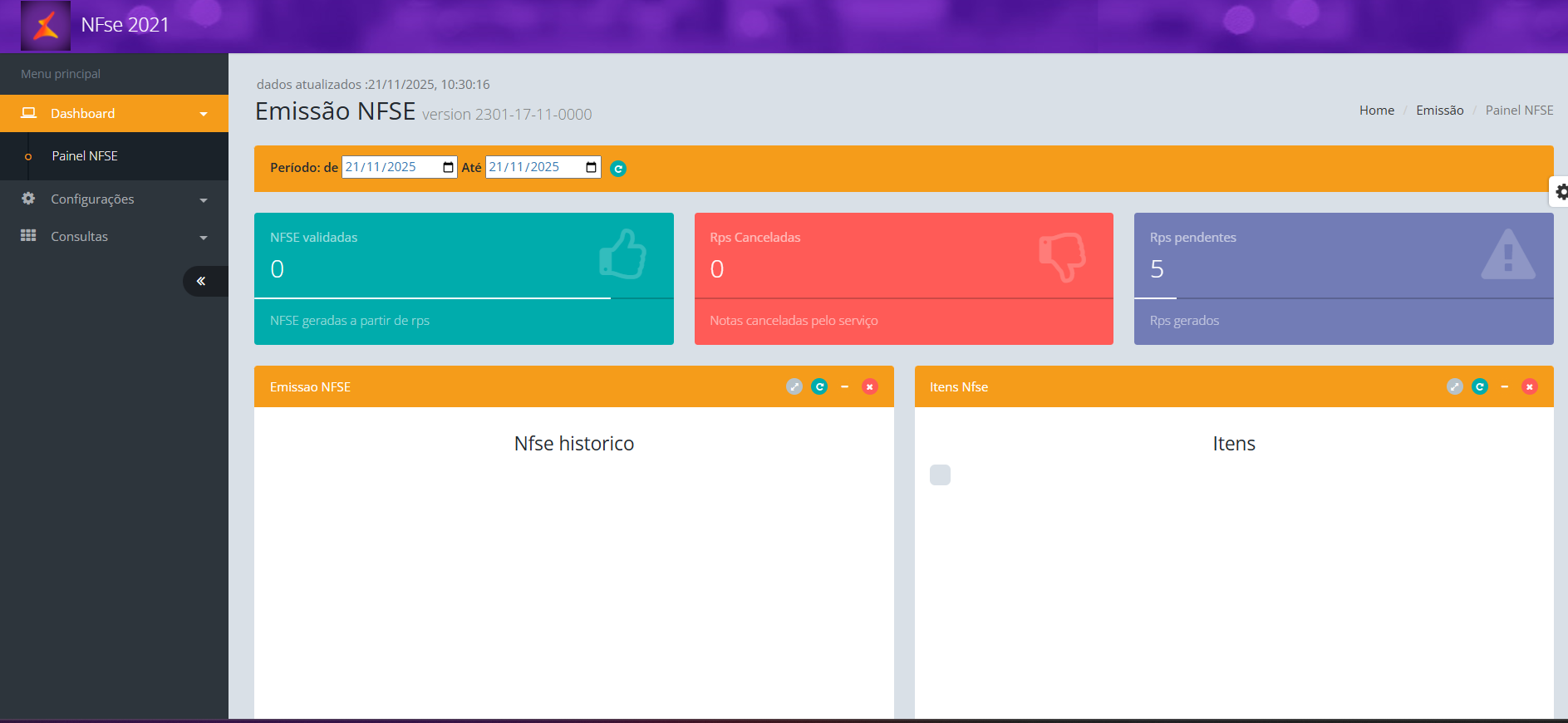 1. Ao acessar o módulo Paine NFSe, será exibido o 'Dashboard';
