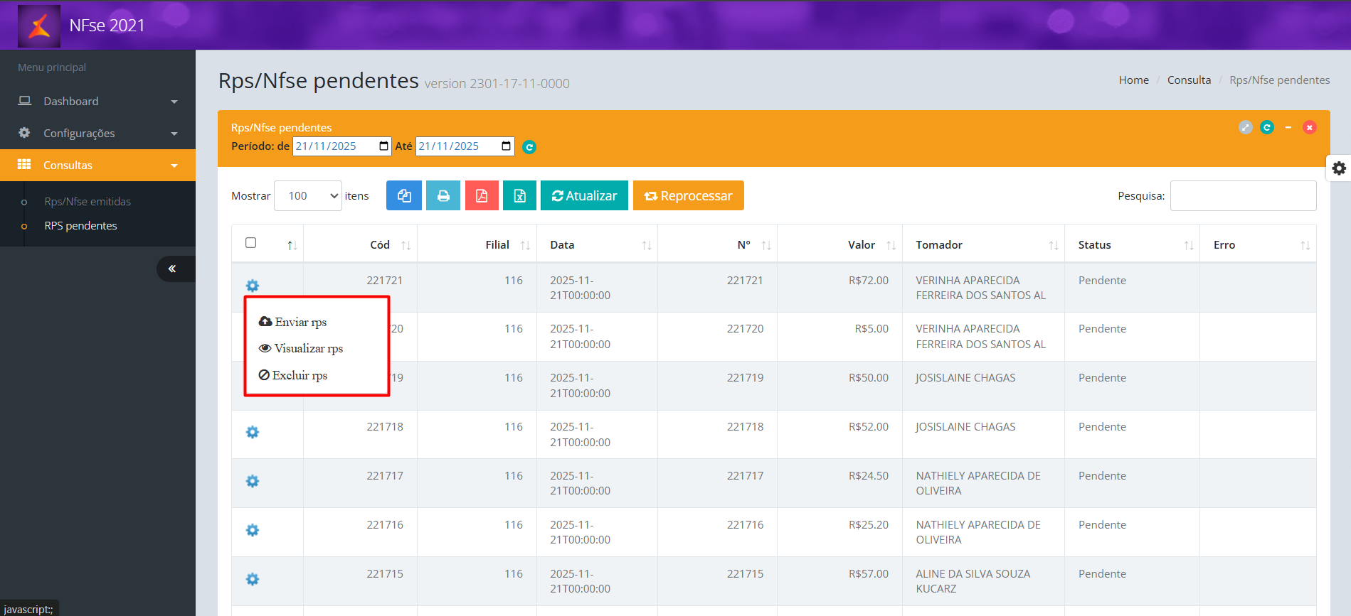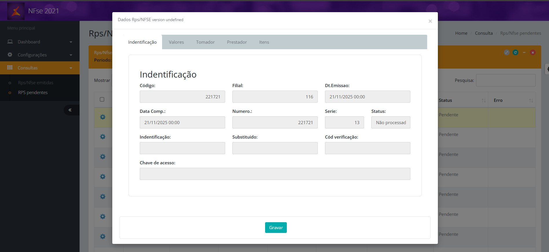 3. Será exibida a tela 'Rps/Nfse pendentes';