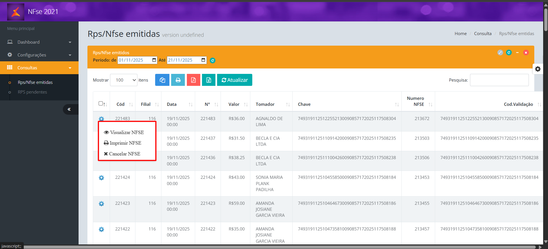 8. Será exibida a tela 'RPS/Nfse emitidas';