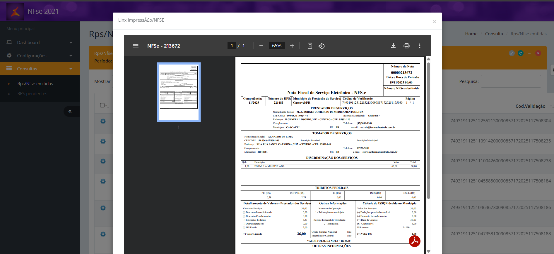 7. Acesse o menu lateral Consultas > Rps/Nfse emitidas;