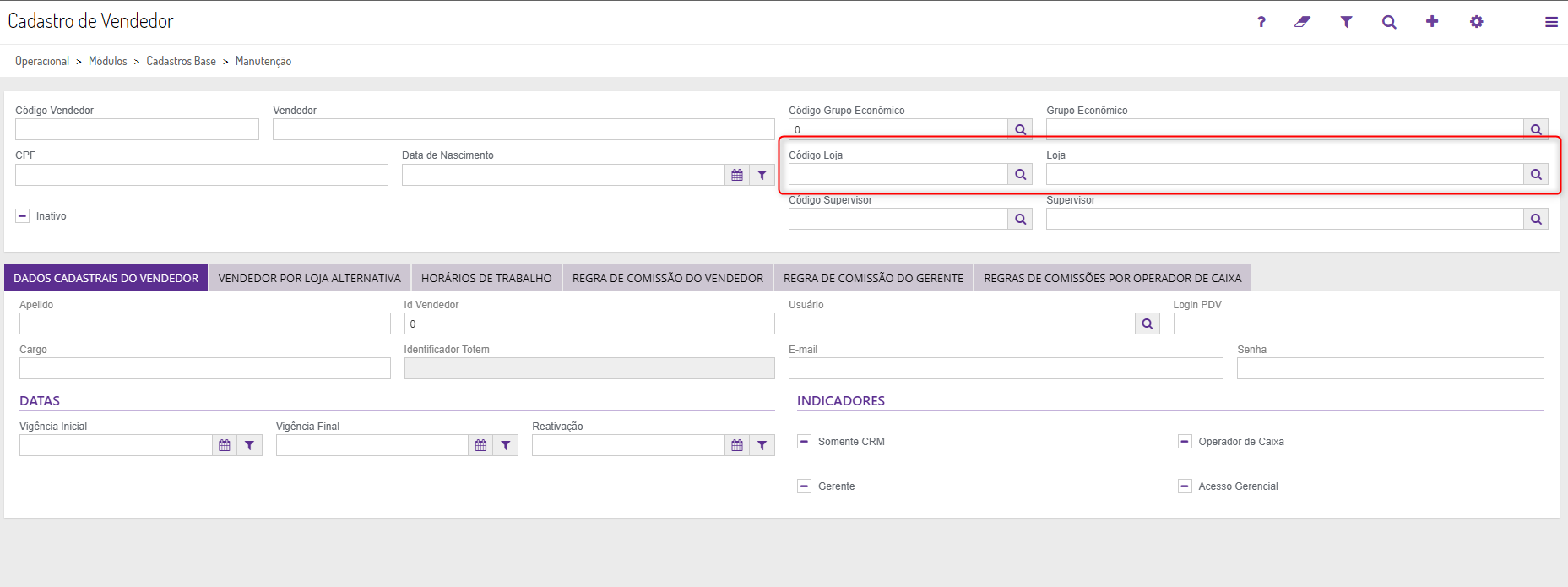 1. Acesse no Linx UX a tela Cadastro de vendedor e pesquise pelo código da filial, conforme a imagem abaixo: