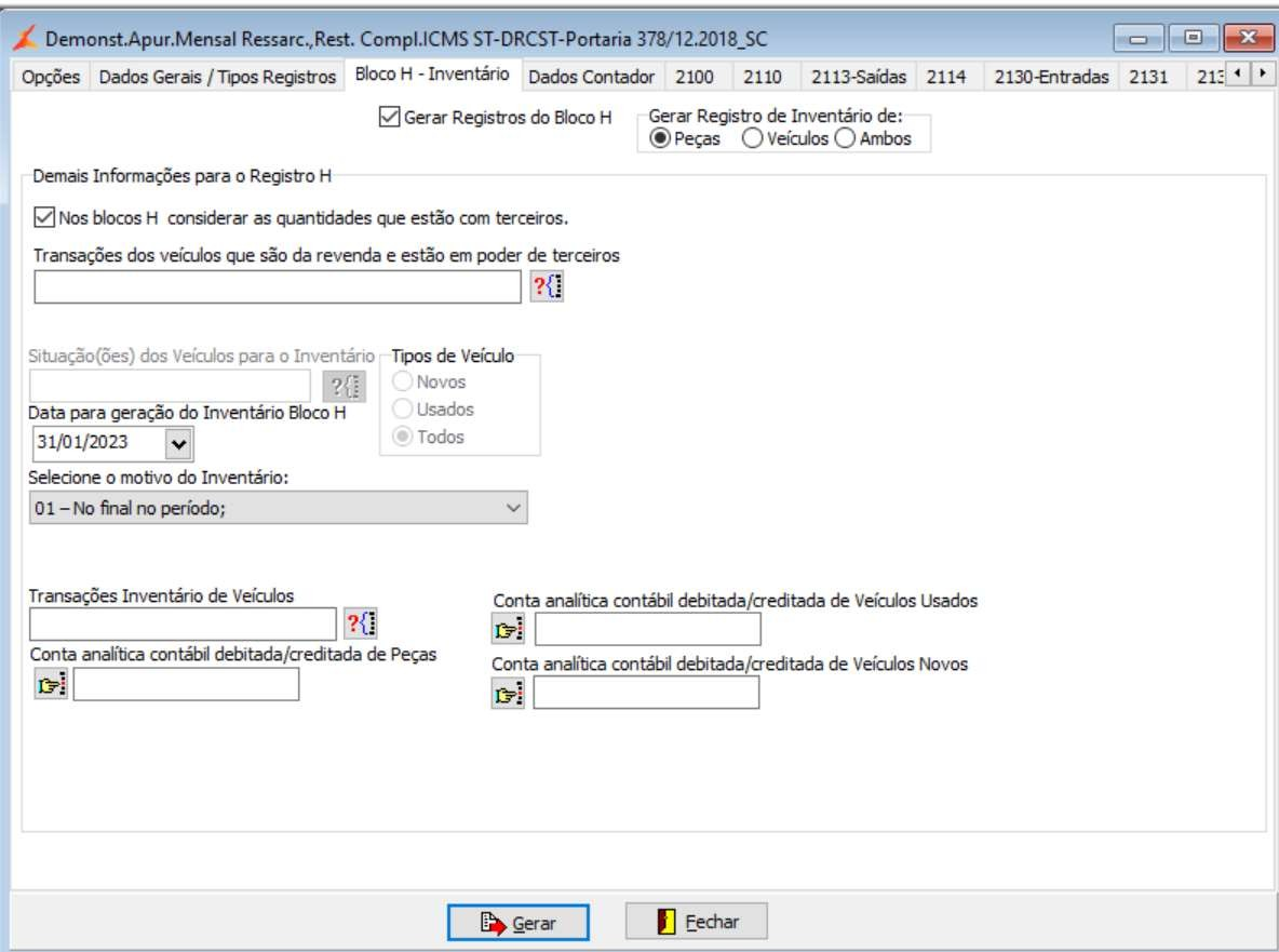 Selecionar a opção “Gerar Registro do Bloco H”, conforme orientação da legislação pertinente