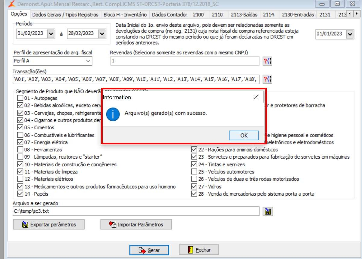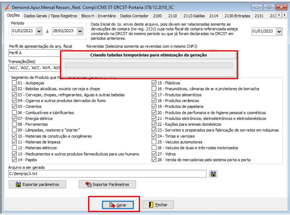 Após executado os passos do Item 1.1 a 1.5, clicar na opção “Gerar”, será gerado e salvo no diretório informado no Item 1.1 – Letra G o arquivo do “Demonstrativo para Apuração Mensal do Ressarcimento, da Restituição e Complementação do ICMS Substituição Tributária (DRCST)”
