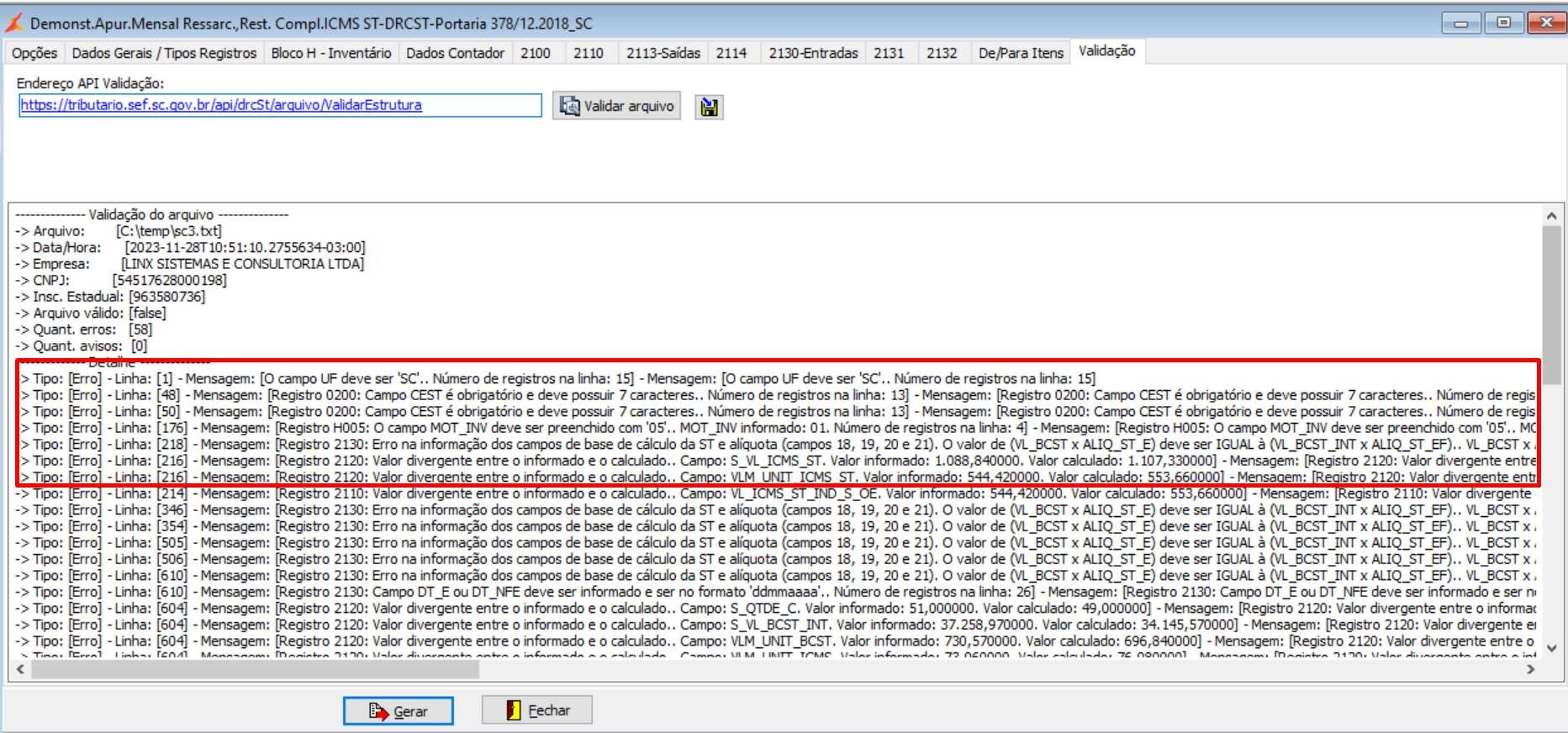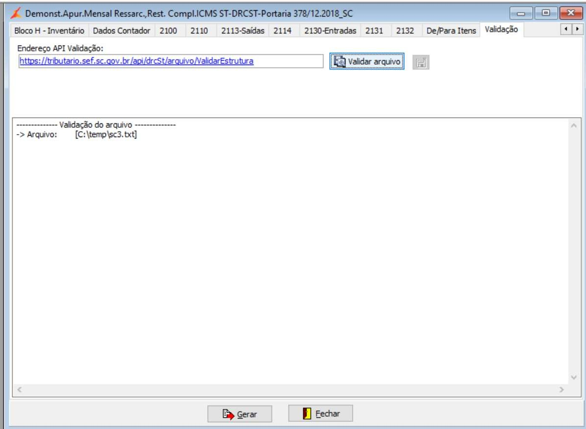 Após a conclusão da geração do arquivo, acessar a aba “Validação”, a fim de verificar se há erros na estrutura do arquivo gerado.