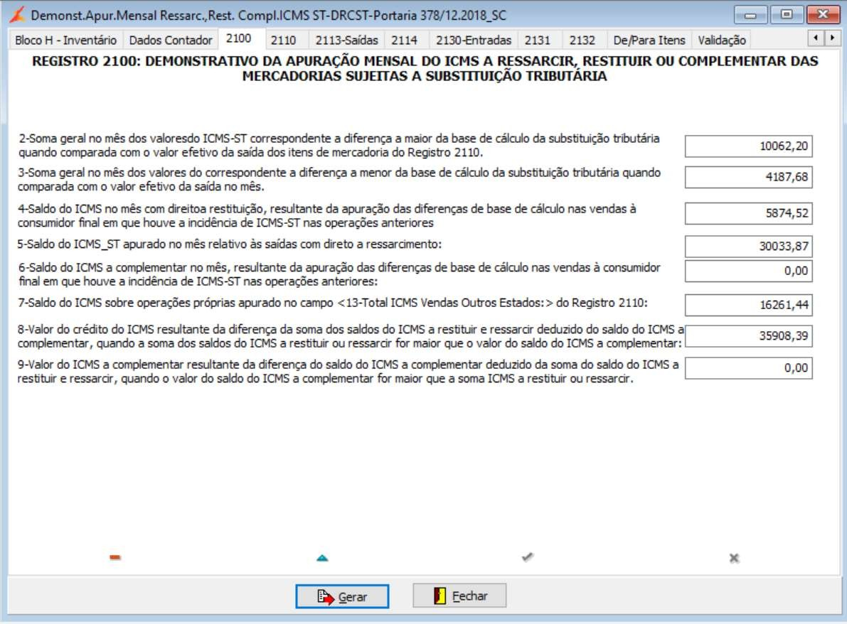 2.1. REGISTRO 2100: DEMONSTRATIVO DA APURAÇÃO MENSAL DO ICMS A RESSARCIR, RESTITUIR OU COMPLEMENTAR DAS MERCADORIAS SUJEITAS A SUBSTITUIÇÃO TRIBUTÁRIA