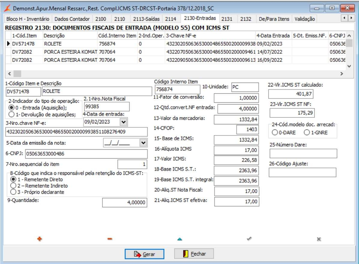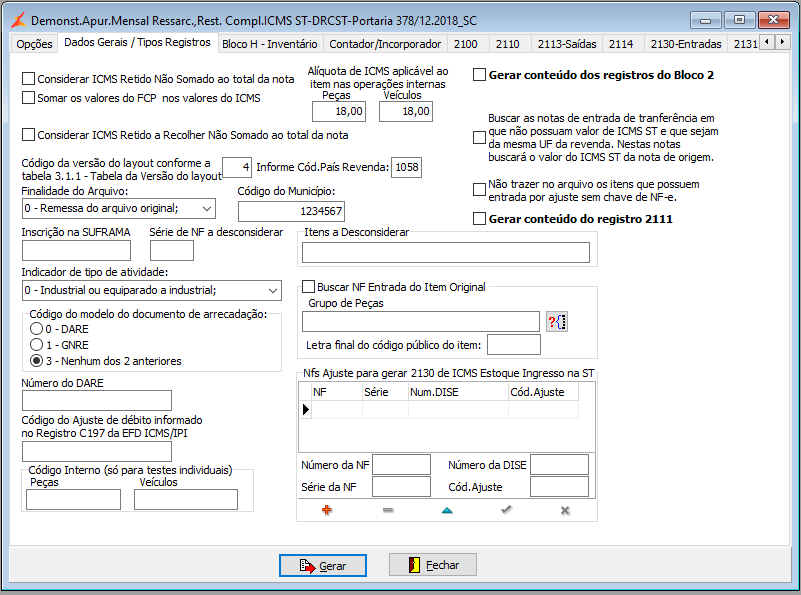 S. Opção  "NFs Ajuste para gerar 2130 de ICMS Estoque Ingresso na ST"  para adequação a  Portaria SEF nº 195, de 22.07.2024 - Pe/SEF SC de 06.08.2024 : Informar a nota fiscal e serie em que foi efetuado a opção de ajuste de entrada no regime de ST e os devidos Numero de DISE e Cód Ajuste.