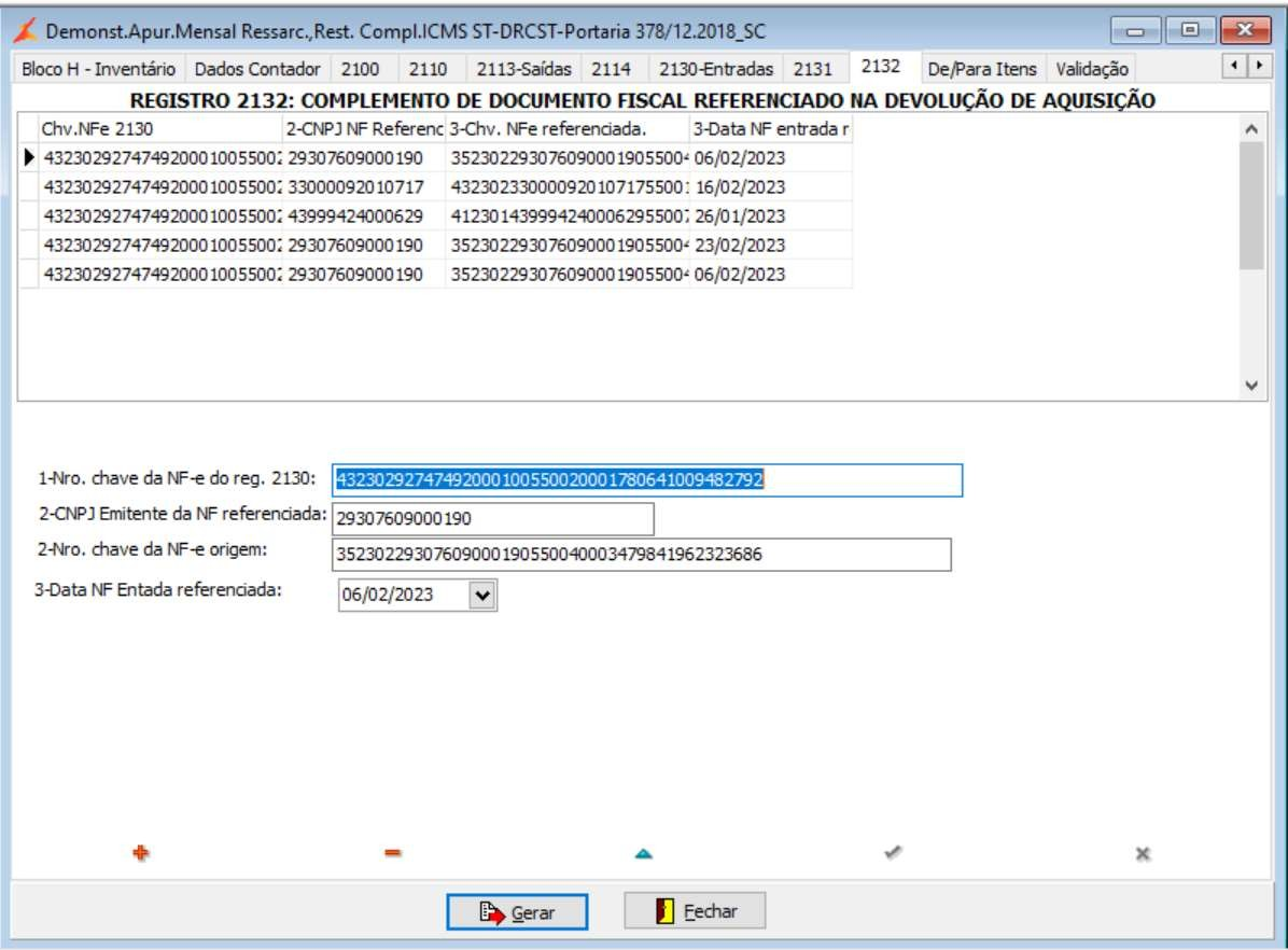 Não podem ser informados, para uma mesma NF-e de devolução de aquisição informada no Registro 2130, dois ou mais registros com a mesma CHAVE_NFE_REF.