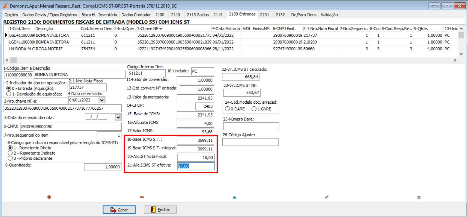 Mensagem: [Registro 2130: Erro na informação dos campos de base de cálculo da ST e alíquota (campos 18, 19, 20 e 21). O valor de (VL_BCST x ALIQ_ST_E) deve ser IGUAL à (VL_BCST_INT x ALIQ_ST_EF).. VL_BCST x ALIQ_ST_E = 3.699,11 x 18,00 % = 665,84. VL_BCST_INT x ALIQ_ST_EF = 3.699,11 x 17,00 % = 628,85.