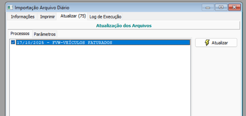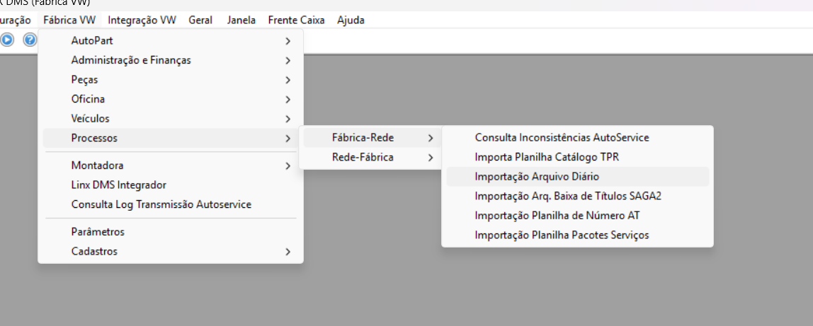 Acessar a opção de importação de arquivo diário através do Menu  "Fábrica VW" > "Processos" > "Fábrica-Rede" > "Importação Arquivo Diário":