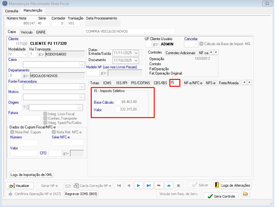Ao realizar a consulta da nota, os campos apresentarão as informações recebidas na importação do arquivo FVW.
