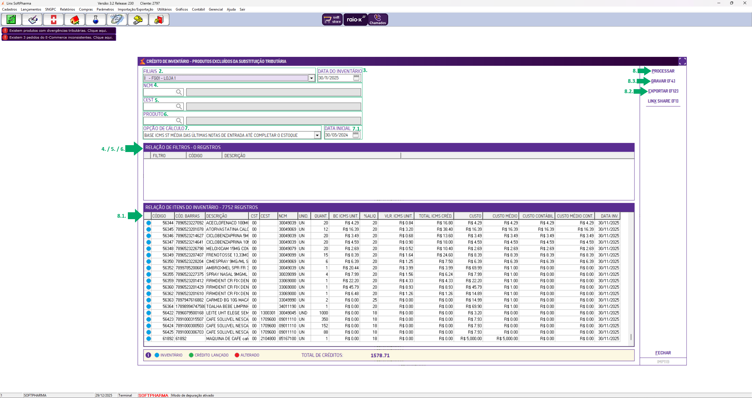 Atenção: após realizar o o registro de inventário de crédito, faça o processamento do inventário. Para maiores informações de como processar o inventário, verifique o artigo: Linx Escrita Fiscal - Configurador Connector - Como processar o inventário.
