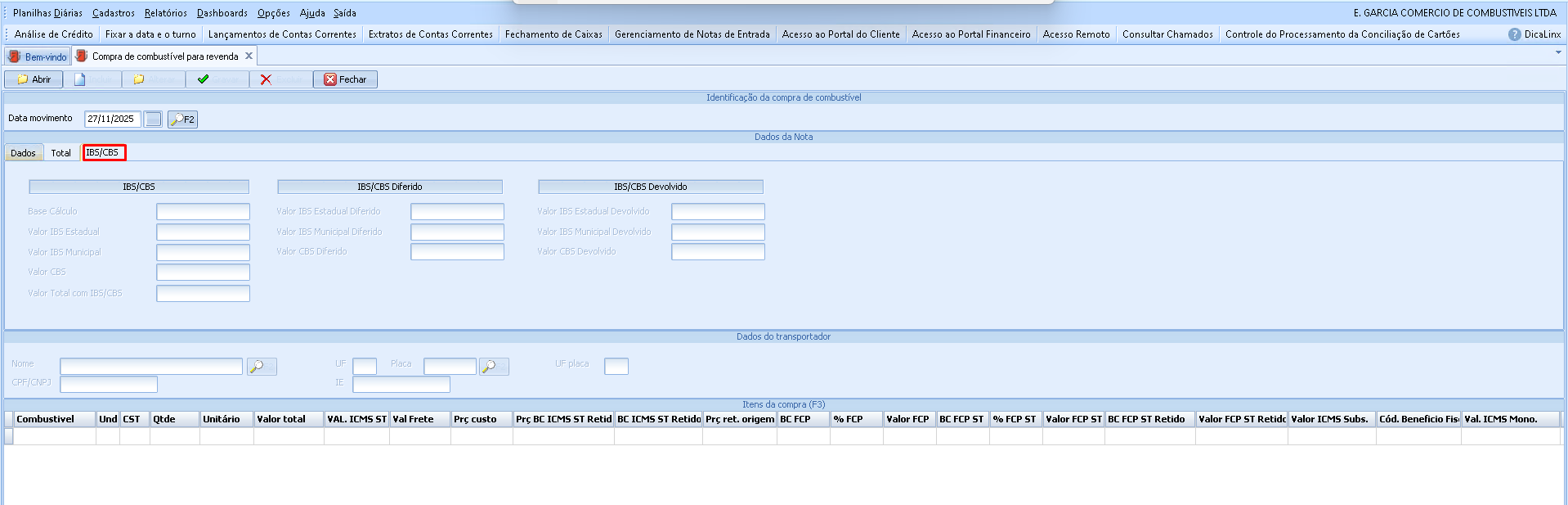 Para cumprir as exigências da Reforma Tributária, as telas de Compra de Produtos para Revenda/Consumo/Imobilizado, Compra de Combustíveis para Revenda e o módulo de Outras Notas Fiscais já foram atualizadas, passando a contar com a nova aba de IBS/CBS.