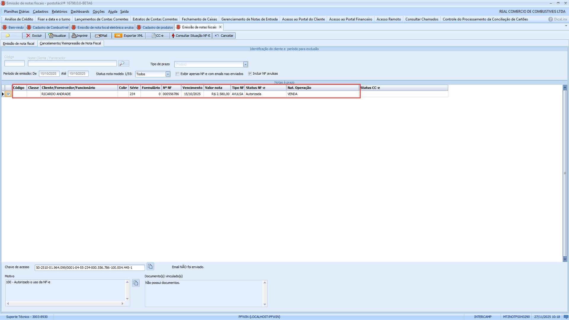 Além disso, a opção “Excluir e emitir uma nova nota” só será exibida quando a empresa tiver permissão para exclusão de NF-e pendente no perfil da retaguarda.