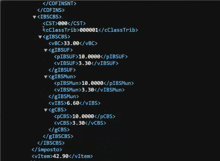 • O XML apresenta as novas tags referentes à tributação de CBS/IBS.