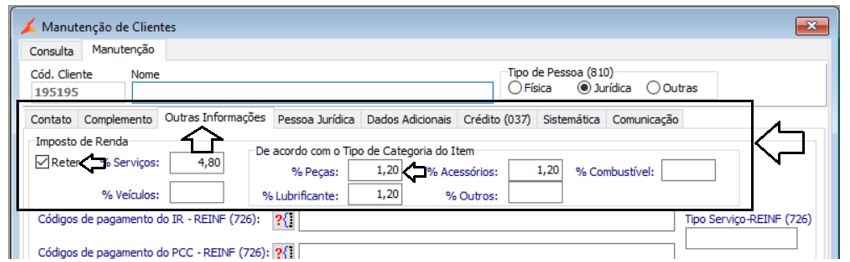Manutenção de clientes da aba <Manutenção> Outras Informações> quadro > Imposto de Renda: