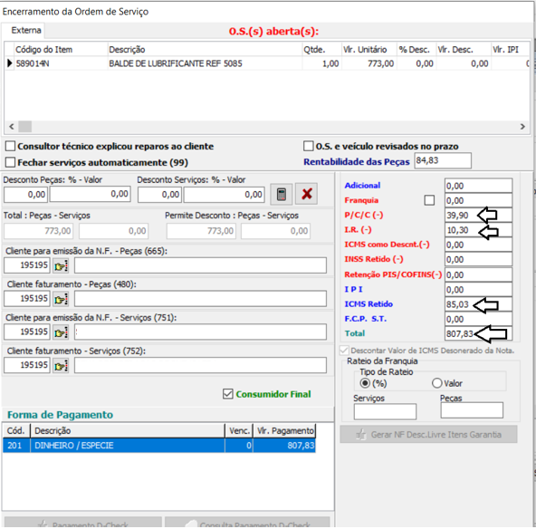 Exemplo do cálculo no fechamento de uma Ordem de Serviço.