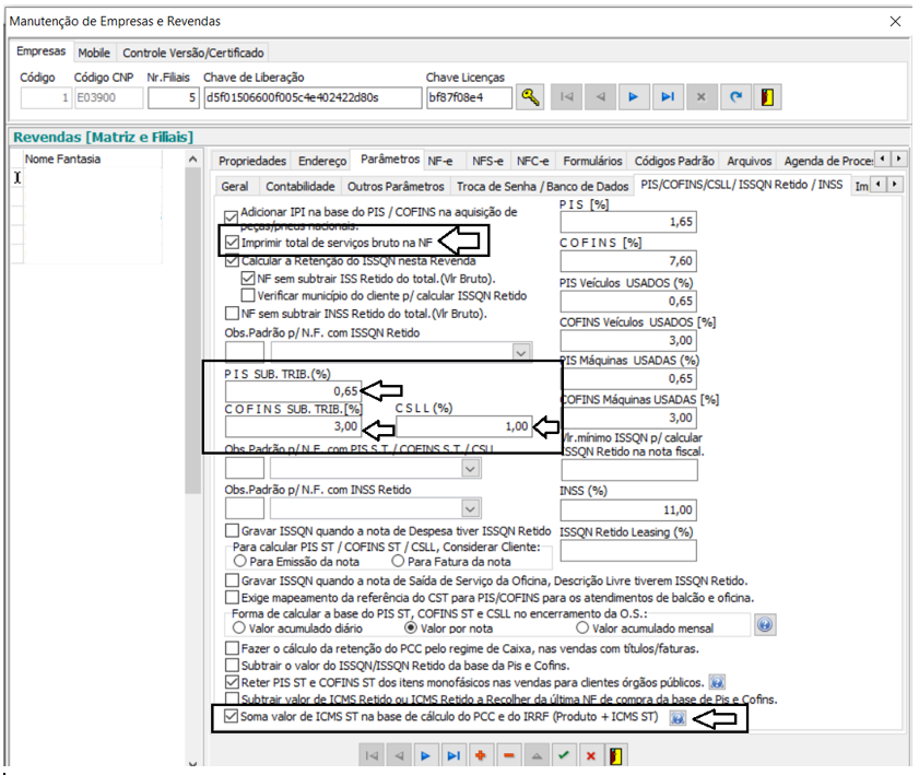 Na manutenção Empresas e revendas > Parâmetros > PIS/COFINS/CSLL/ ISSQN Retido / INSS >