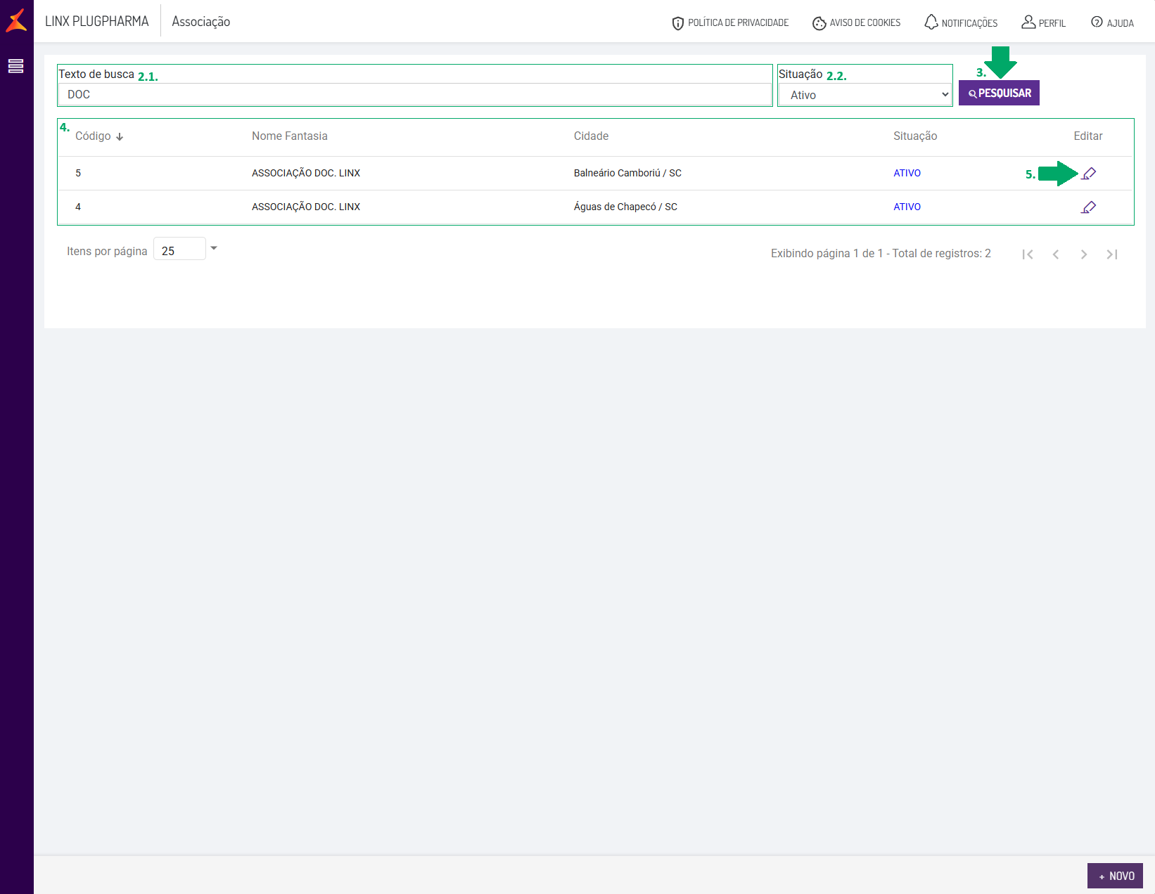 Como pesquisar e editar um cadastro de associação, no módulo Plugpharma?